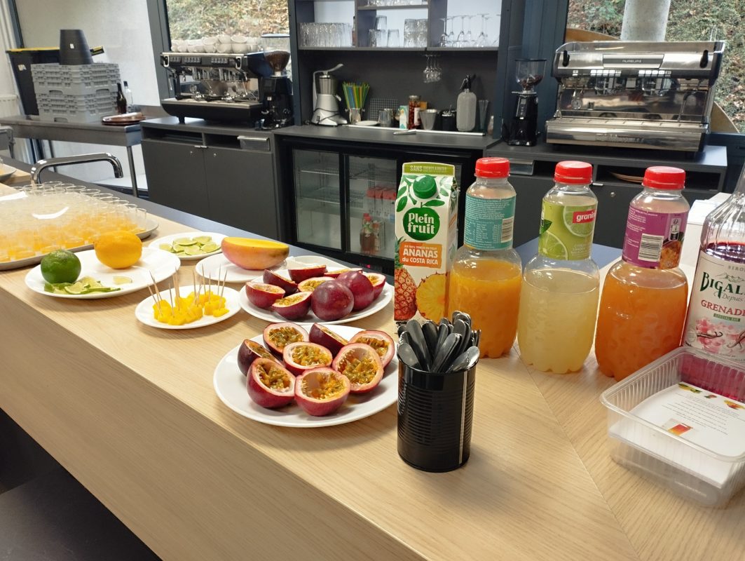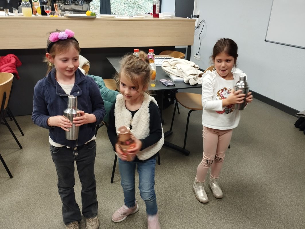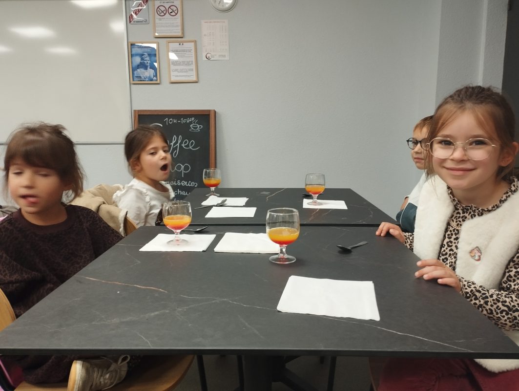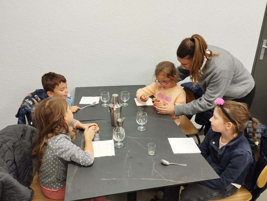 Dans un premier temps, ils se sont installé dans la salle du bar pour déguster et découvrir différents fruits, qui allaient être utilisés par la suite (mangue, fruits de la passion, citron vert…). Ensuite, ils ont tous préparé dans un shaker différents mélanges afin de réaliser un très joli cocktail multicolore. Tous étaient émerveillés par ces belles couleurs. Est ensuite venue l’heure de la dégustation!