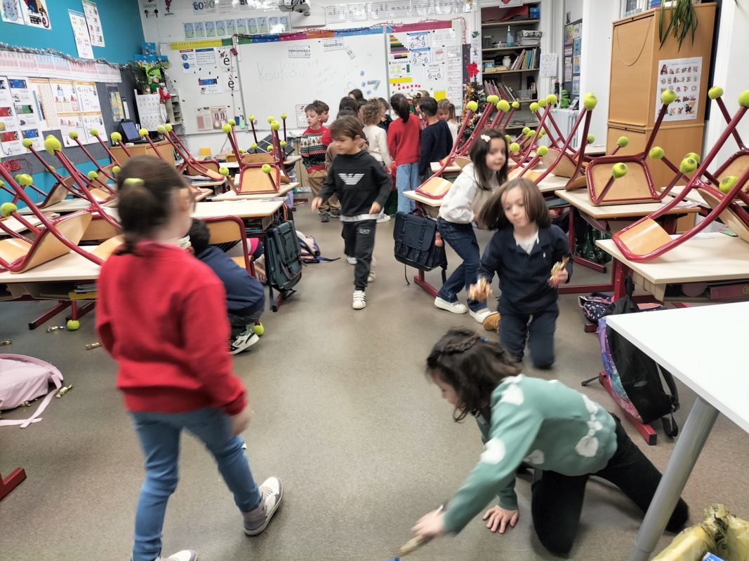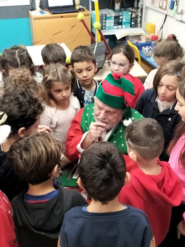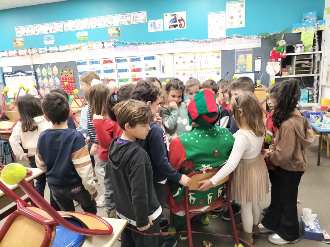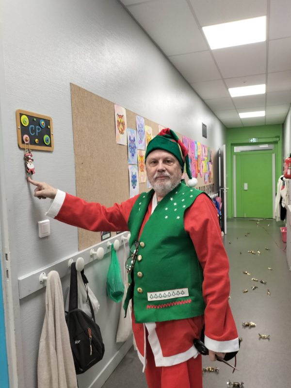 Vendredi, nous avons vécu un moment magique. En arrivant, il y avait des papillotes partout dans le couloir puis dans notre classe. Puis nous avons entendu un ronflement et nous avons découvert Enguelmar endormi dans la classe sur une couchette des petites sections vers le sapin ! On l’a regardé dormir. On avait envie de le réveiller mais on n’osait pas et certains avaient aussi un peu peur…