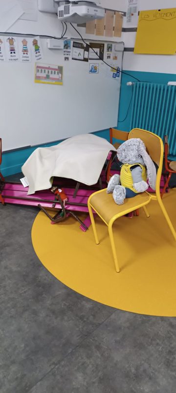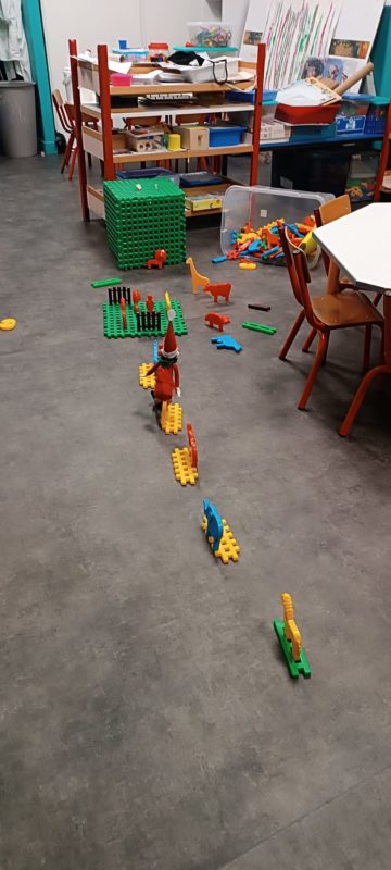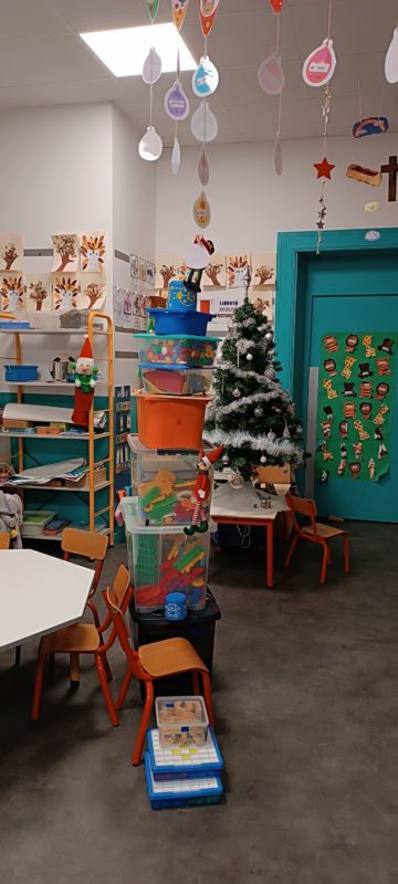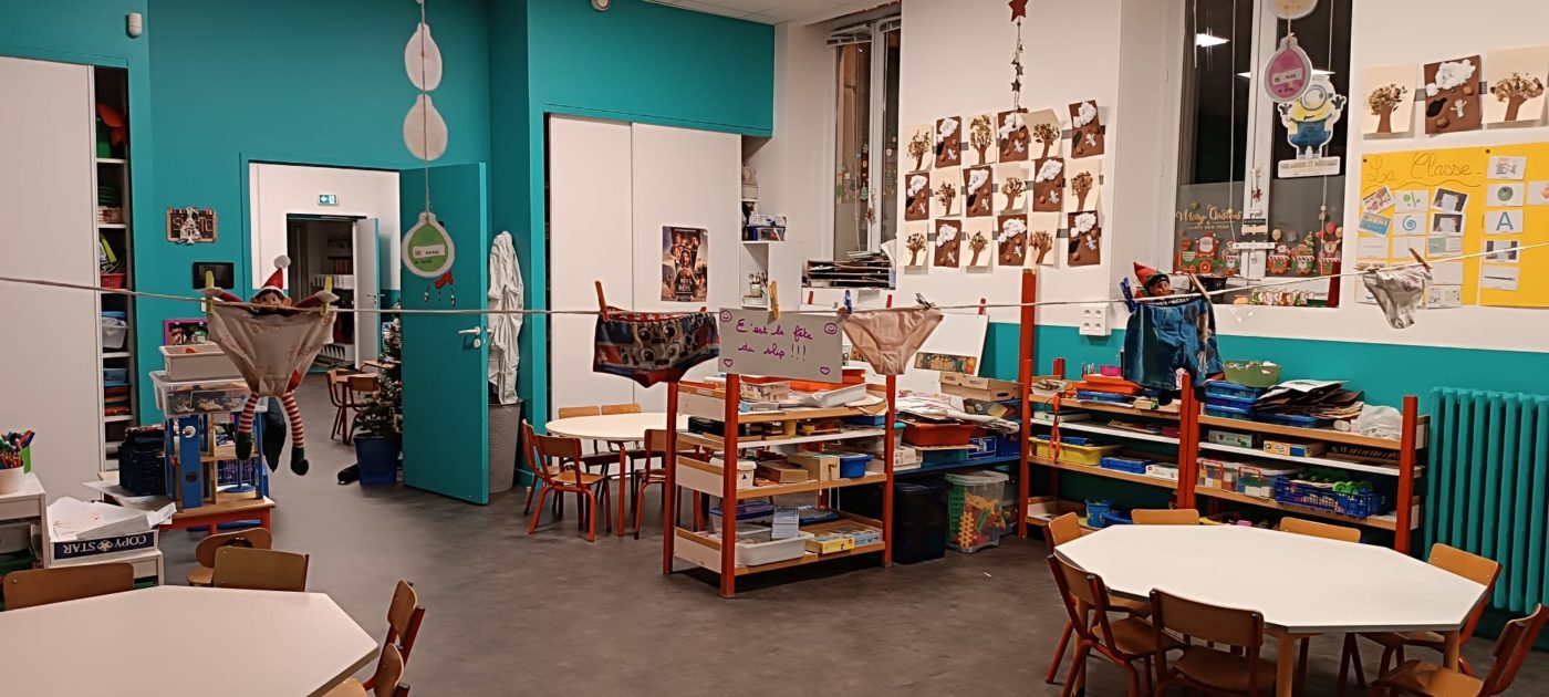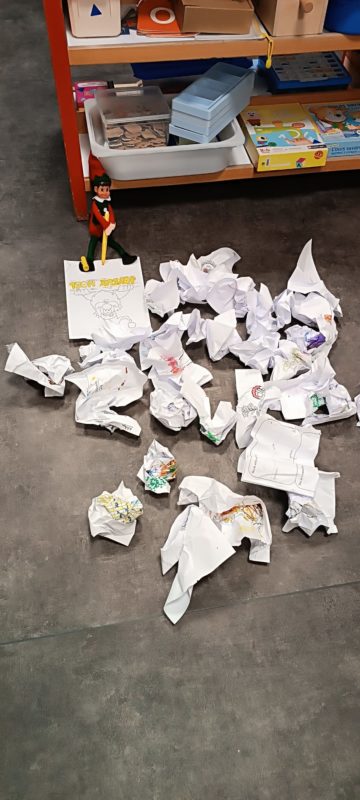 Ils ont  mis un sacré Bazard ! Par exemple, ils ont renversé les bancs et cachés nos étiquettes de présence. Un autre jour, ils ont sorti tous les jeux et fait une immense tour avec, ou bien encore ils ont étendu les caleçons et culottes dans la classe, Fripouille avait même mis une culotte sur sa tête … On a dit au Père-Noël, quand il est venu nous voir, qu’ils  étaient très polissons et il les a grondés fort. Mais quand même, ils ont continué de faire des bêtises comme entourer notre sapin de papier toilette…