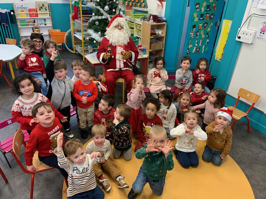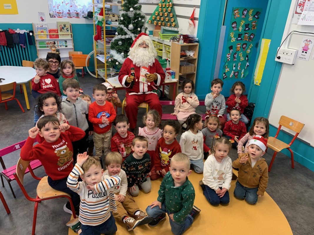 Le vrai Père-Noël est passé nous voir dans notre classe. Il avait garé son traineau sur le toit de l’église, juste à côté de l’école. La maîtresse et Véronique l’ont même vu s’envoler avec l es rênes.